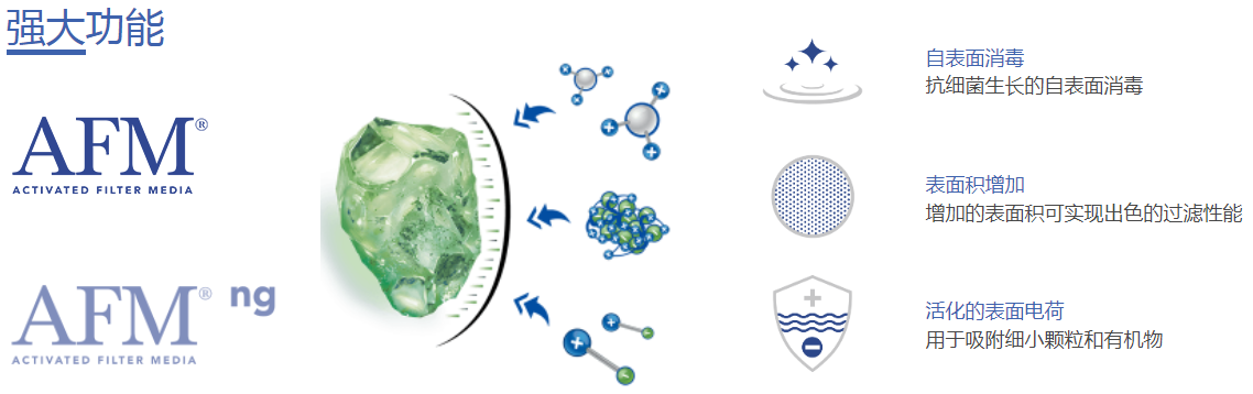 而AFM滤料由绿色和棕色玻璃制成,是一种经过加工后得到合适的颗粒大小和形状。然后对其进行3步活化处理,可以抑制微生物生长,表面自带消毒功能的滤料。是英瑞公司经过了多年研究所得的。过滤精度达到1微米,可以滤除水中微小微生物的物质。具备优异的吸附功能,可吸附去除水中的重金属和微塑料,从源头杜绝微生物的生长,不产生二次污染,大幅度的减少了消毒药剂的使用。也提高了水的清澈度。经过实验和使用证明,过滤效率是砂过滤的两倍以上,反洗速率和时间比砂过滤减少。 节省了水源,是一款环保型滤料。使也比石英砂耐用,不会板结,不需要经常更换。甚至在英国、美国和许多其他国家获得饮用水安全和卫生认证。